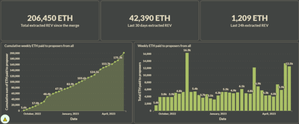 根据 Flashbots 提供数据显示,截至 2023 年 7 月初,在以太坊 The Merge 之后,已实现 206,450ETH 的 REV 提取。但这仅仅是 Block Proposer 接收到的 MEV 收益,Searchers 的收益尚未计算在内。