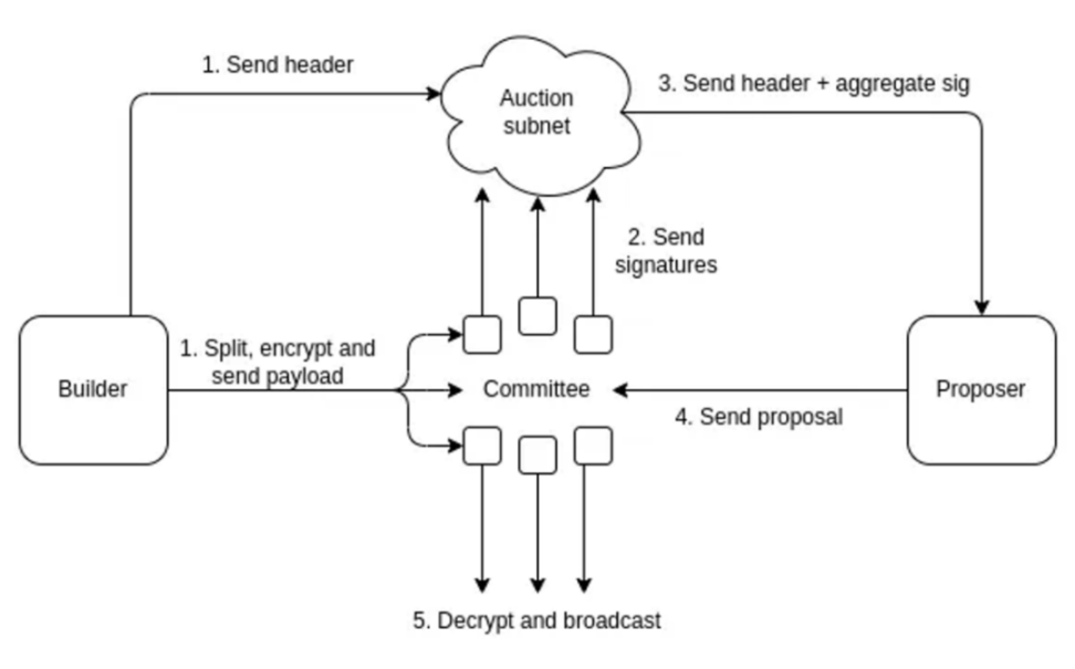 Single Slot PBS 由去中心化的 committee 作为中介保管区块的内容,builder 将 bundle header 发送给 Auction 子网,同时将分块加密后的 bundle body 发送给 commitee,待 commitee 投票超过阈值后,由 proposer 发送 proposal,commitee 收到后,将 bundle body 进行解密并广播,能够在单个 slot 完成 PBS 的出块。