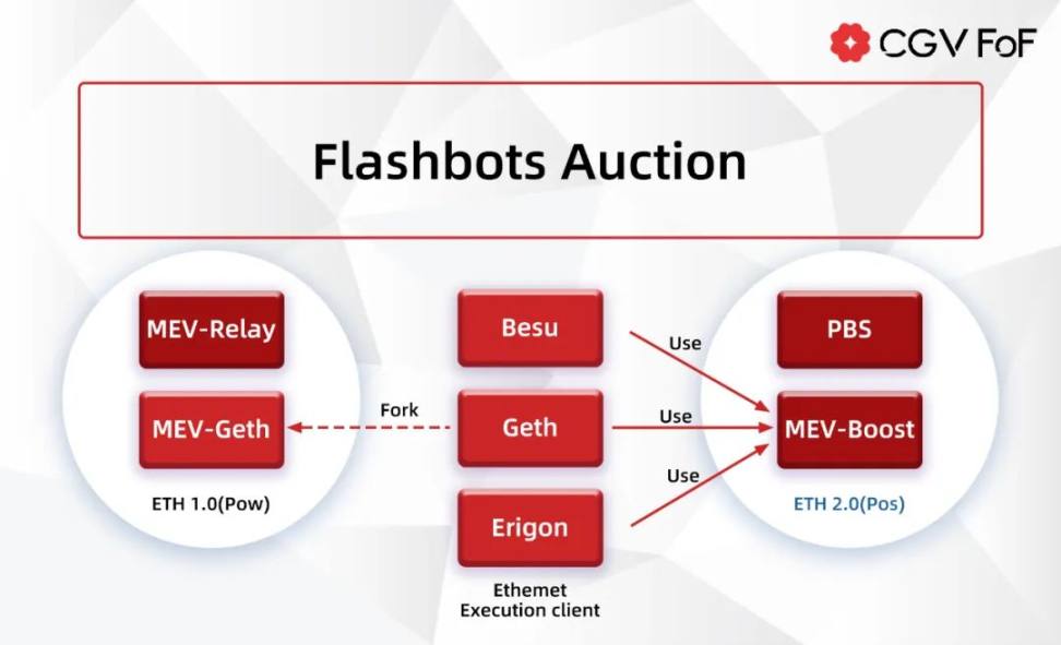 Flashbots Auction 实际由两个阶段组成,分别是 ETH1.0(Before The Merge)的 MEV-Geth 和 ETH2.0(After The Merge)的 MEV-Boost。