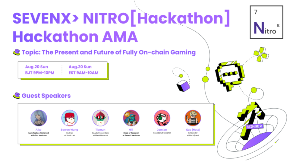 我们邀请到了 CheDAO 的创始人 Damian,Mask Network 的 Tianran(天然),SevenX Ventures 的 Hill, Smrti Lab 的 Bowen 与 Folius Ventures 的 Aiko 一起在 Twitter Space 做一期 Nitro 黑客松的 AMA 并聊聊完全链上游戏的发展与未来。