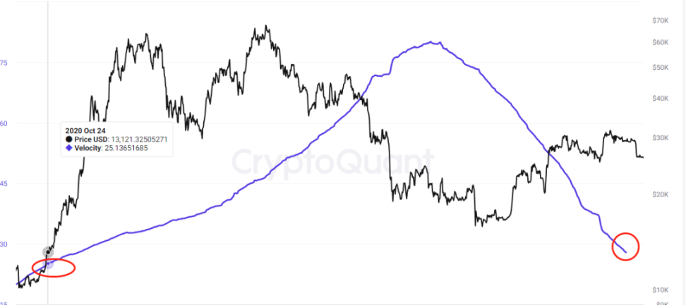 昨天出了一个重要但没怎么受到关注的消息,来自加密数据分析平台 CryptoQuant 发的一则推特,大概意思是说,目前比特币的流通速度处于 3 年来的最低点。