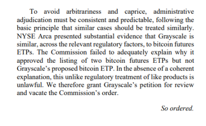 法官对此表示同意,SEC 拒绝灰度的申请是武断且没有依据的(acting arbitrarily and capriciously),因为 SEC 未能解释其对类似 ETF 产品的有何不同处理方式。因此,法院认为这种区别对待的行政行为违反了行政法,同意灰度的请求并撤销 SEC 的拒绝申请的行为。