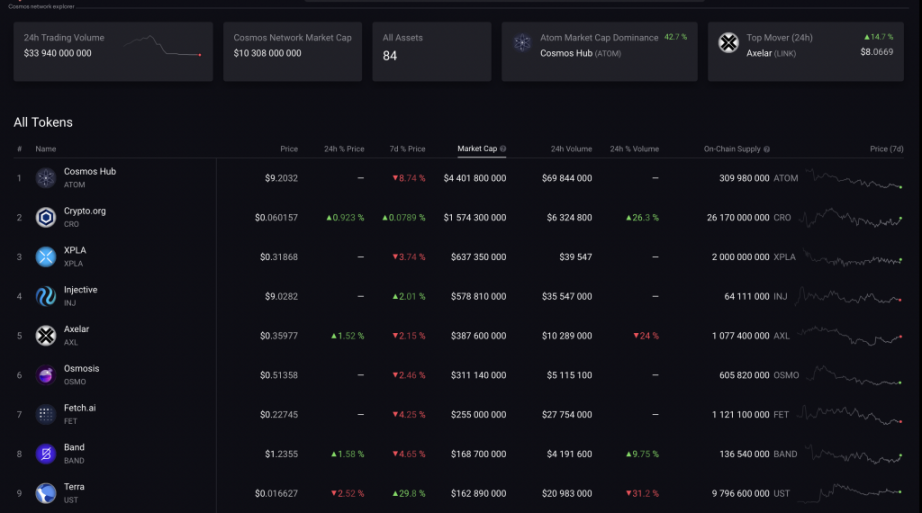 据 mapofzones.com 统计,截至今年 7 月 21 日,Cosmos Network Market Cap(Cosmos 生态项目市值总和 ) 为 103 亿美元,ATOM 成为生态中市值最高的 Token,ATOM Market Cap Dominance(ATOM 市值占比)为 42.7 %。