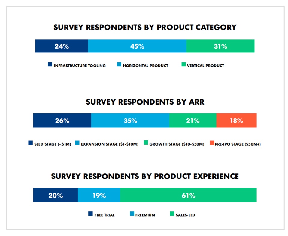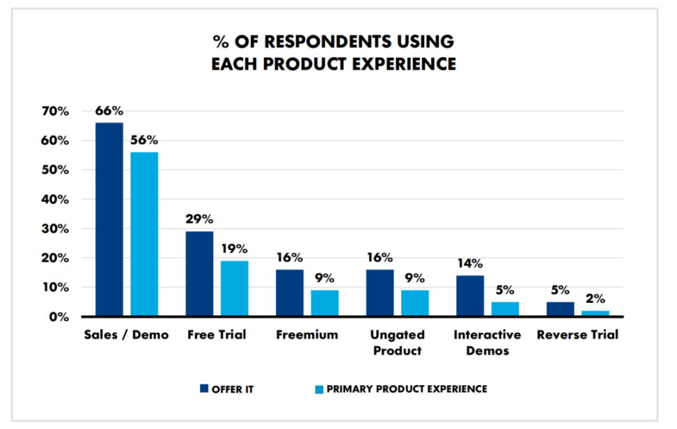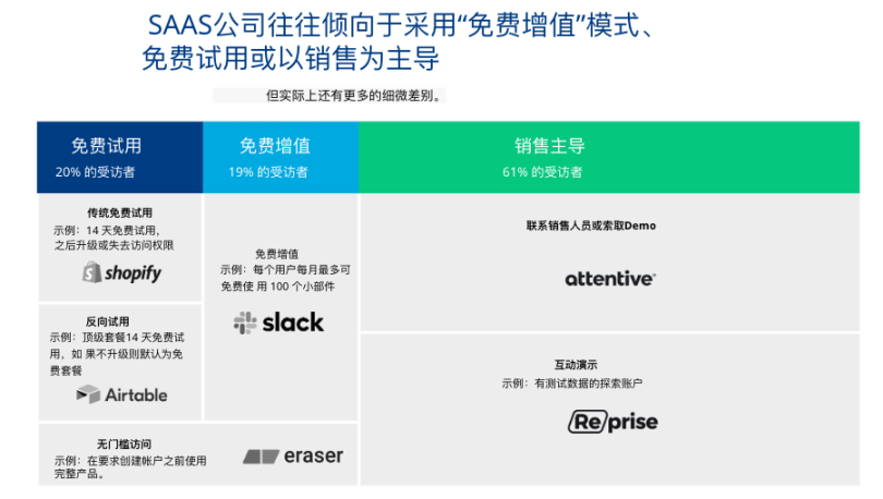 • 大多数公司为新用户提供多种入门的使用方式。今年我们查看了无门槛的产品(16%)、交互式演示(14%)和逆向试用(5%)。
