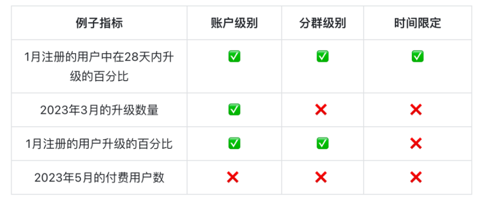 下面的图表显示了四种可能的转化测量方法。虽然有些可能有助于财务报告,但只有第一种是强有力的转化指标,因为它是基于账户级别、分群和时间限定的。这三个组成部分对于保持一致性和可靠性至关重要。