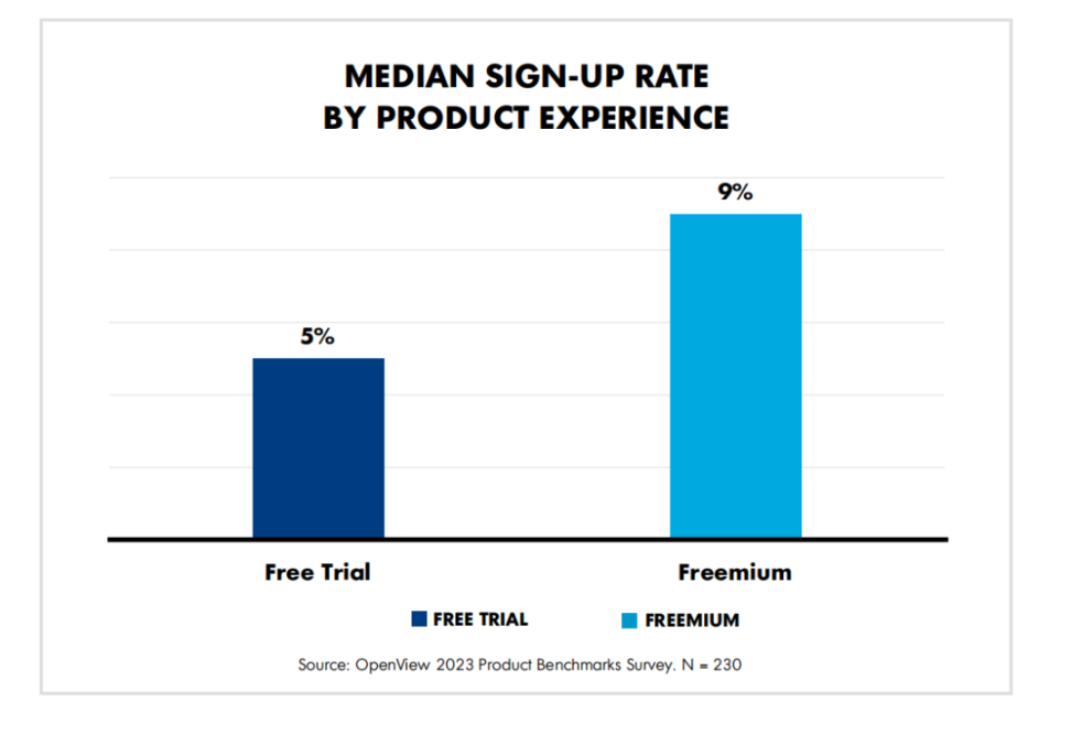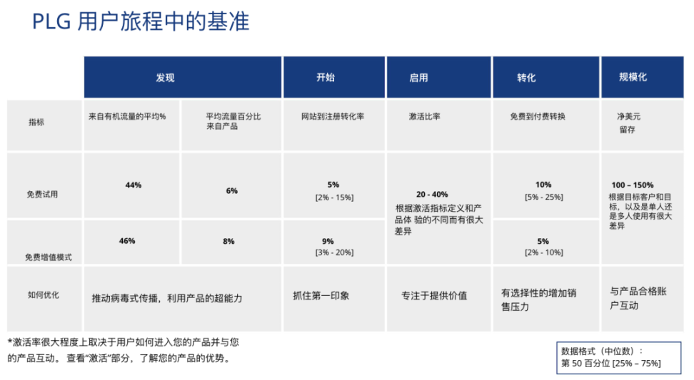 对于 PLG 产品来说免费试用( free trial ) 的转化率大概有 10%,免费增值( freemium ) 的转换率大概有 5% 。