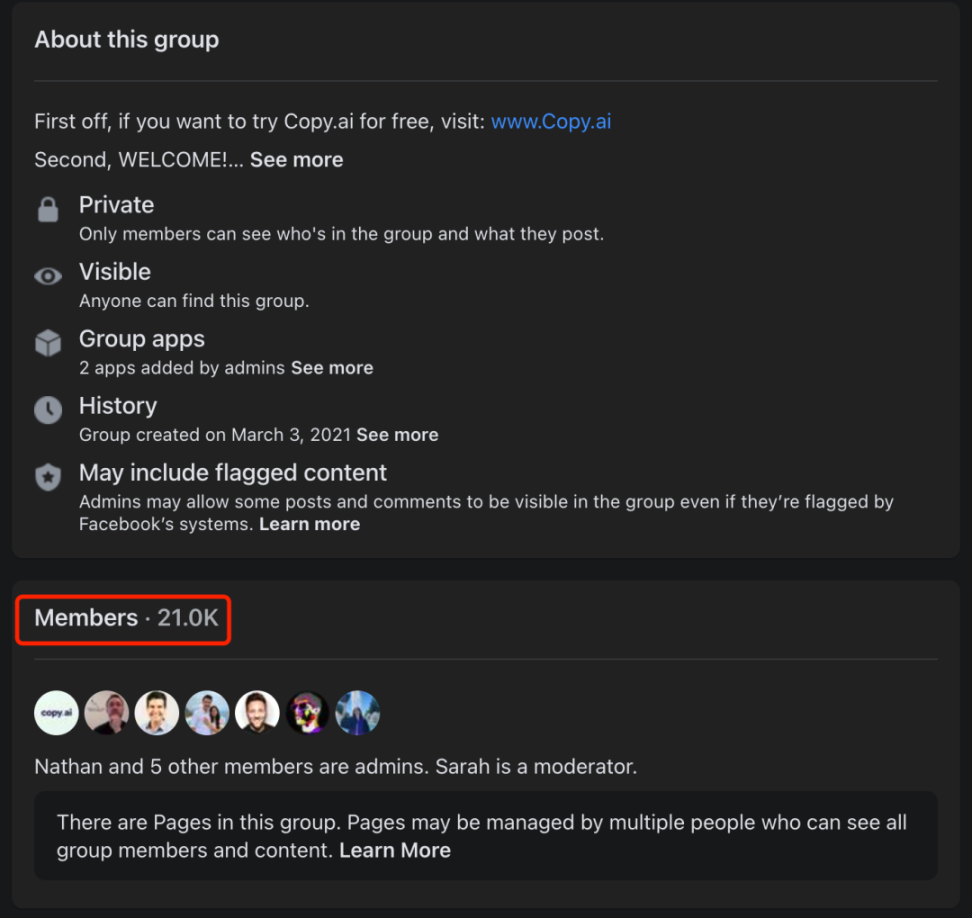 除了针对个人的市场合作,Copy.ai 也在这些社交平台上建立起自己的社群,比如他们在 Facebook 上建立的社群就有 4000 多人,虽然不是每个进群的人都是 Copy.ai 的用户,但这能帮助更多的非注册用户了解产品以及互动反馈。