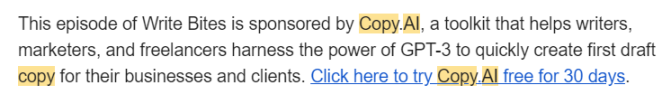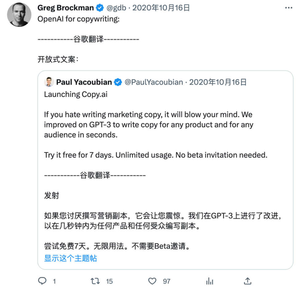 当然,Copy.ai 在联名搞活动之余,也不忘撒一波用户福利,对于通过 SPI 转介绍的用户,可以获得首年 4 折优惠以及 30 天的免费试用,而 Copy.ai 官网其实只能薅 7 天羊毛。除了 SPI 这样正式合作的案例外,也有和当时体量差距不大的 OpenAI 非正式的商业互捧: