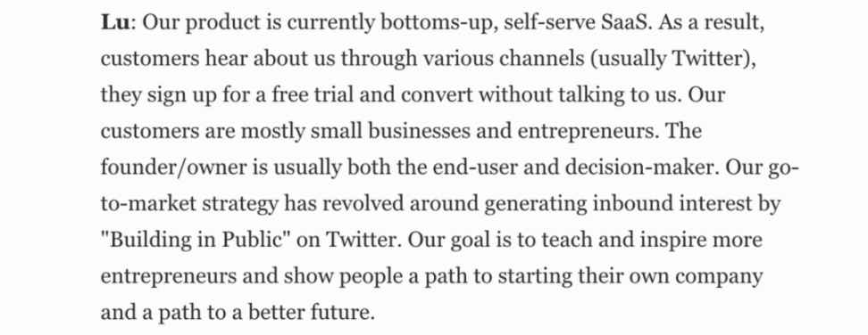 Copy.ai 早期的增长也非常快速,2021 年 10 月的 ARR 仅 230 万美元,1 年后则达到了 1200 万美元,当联合创始人 Chris Lu 当时接受福布斯的采访时,就表示 Copy.ai 的增长策略就是依靠“Building in Public”。