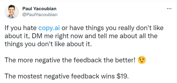 公开分享之后,也就更容易从市场中得到用户的反馈,Yacoubian 就经常发推询问用户意见,通过这些小调研来衡量用户的兴趣,甚至邀请用户私信给予负面意见,然后他会 V 你 19 美金。