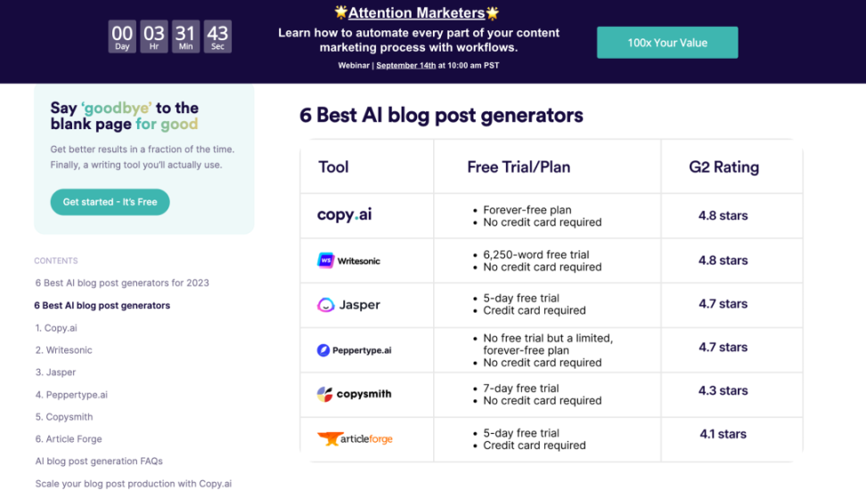 于是,Copy.ai 在博客上将自己和竞品都列了上去,并给规模最大的榜一大哥 Writesonic 和自己打了一个最高分,还附带了详细的理由,这意味着如果有用户在谷歌搜「 Copy.ai 和 XXX 哪个好?」,这篇文章就有概率冒出来,帮用户做决策,让更多的潜在用户选择 Copy.ai。