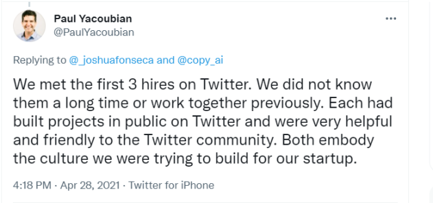 在业务层面,即使在 2021 年非常早期的时候,Yacoubian 就从推上捞了 3 个员工,不算当时新招募的员工,当时还只是 9 个人的团队,就连 Copy.ai 的第一个正式员工,后来的 CMO 也都是推上捞的,而在公开环境中捞人,也让推上更多的潜在团队伙伴提前了解 Copy.ai,提高匹配的效率。