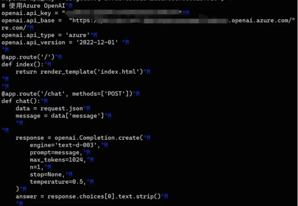 如果没有 SK, 应用对 OpenAI 的调用如下图所示:在 web app 的代码中写上 Azure OpenAI 的 key、endpoint、模型、温度、max_token 等超参、需要构造输入和输出方法。