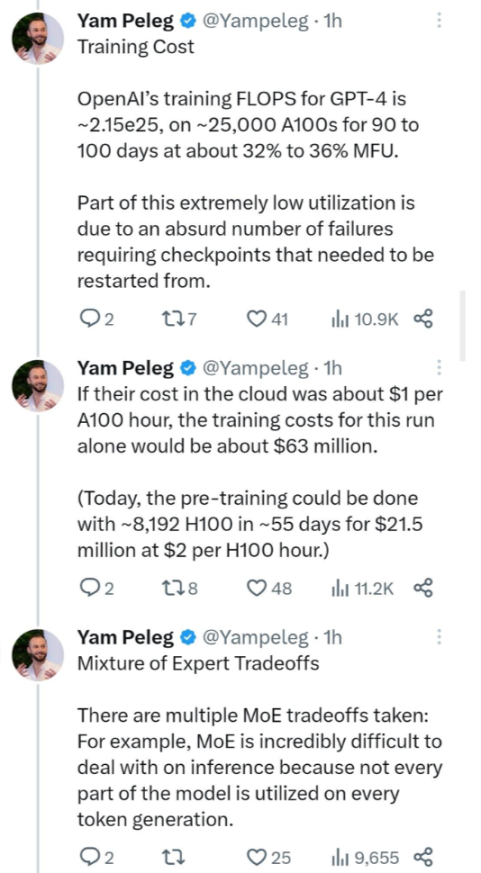 如果 OpenAI 在云端每个 A100 GPU 的成本大约为每小时 1 美元,那么仅此次训练的成本将达到约 6300 万美元。(而如今,如果使用约 8192 个 H100 GPU 进行预训练,用时将缩短至约 55 天左右,成本为 2150 万美元,每个 H100 GPU 的计费标准为每小时 2 美元。)"