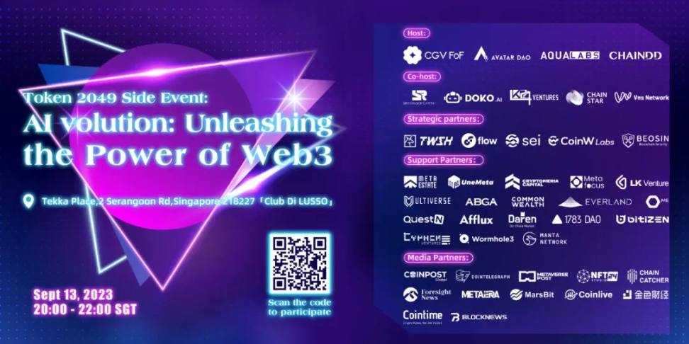 由 CGV FoF 联合 AVATAR DAO、AQUALABS、链得得 CHAINDD 共同主办的 Token 2049 Side Event: AI volution: Unleashing the Power of Web3 活动将于 9 月 13 日晚 8 点在新加坡掀起一场关于 AI 和 Web3 的对话酒会。