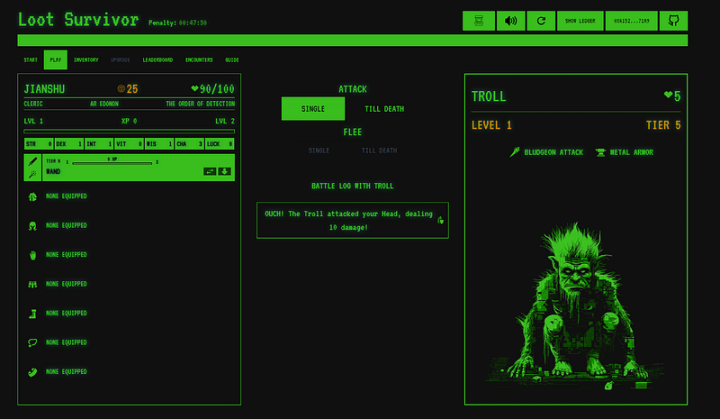 不同于 Gamefi 采用的各种「X to Earn」模式,Loot Survivor 采用的是 Loot Realms 团队设计的「Play to Die」模式。玩法上简单来说就是玩家需要花费少量资金铸造一个链上冒险家角色,如果冒险家在游戏中死亡该角色生命将被没收,玩家就需要重新创建一个角色并重新开始游戏。目前并没有一个很恰当的中文翻译能形象的表达这个模式,笔者暂且将其翻译为「不死不休」或者「血战到底」。