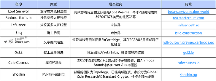 当然,除了以上四个之外,Starknet 上还有许多有潜力的全链游戏,感兴趣的小伙伴可以参考下方表格,笔者因为篇幅原因就不在这里赘述了。