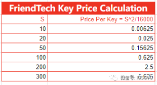 在用户入驻 Friend.tech 并转入至少 0.001E 激活账户后,可以以 0 价格购买自己的第一个 key,后续购买者的 key 价格公式为:(S^2) /16000, S 为总体 key 的数量。价格曲线的设计使得每一个进入者都会推高价格,且后加入者推动的幅度会越来越高。而由于购买数量为整数,所以实际的价格曲线是离散的,而非连续曲线,导致实际的购买价格偏高,而卖出价格偏低。而 16000 是团队考虑市场可能参与人数和流动性之后的选择。95% 以上的房间人数小于 50 人,价格低于 0.156ETH,参与门槛较低。