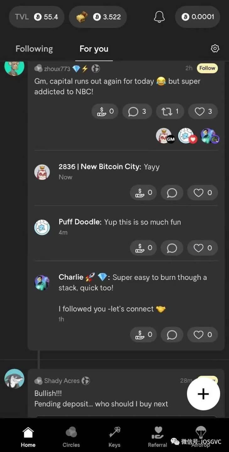 New Bitcoin City 定位为 Bitcoin 上的 Friend.tech, 同样采用了 PWA 开发,支持 BTC, ETH 和 AVAX 支付,迁移了 Friend.tech 和 Star Arena 上的持仓和社交关系,即在另外两个平台上的持仓在登录 New Bitcoin City 时仍然有效且会被聚合。相对 Friend.Tech,其功能更加丰富,群聊支持语音 / 红包 /Gif/ 图片上传,也支持在公开广场发布消息和内容打赏,类似于 Twitter 动态,群聊还内置了五款简单小游戏。为了解决 Friend.tech 中用户(3,3)玩法带来的信任问题,NBC 在合约层面对 3,3 行为进行了约定,强制 30 天不能卖出。房主可以定义进入房间的最低门槛,将 key 碎片化,比如某头部玩家的 key 价格过高时,房主可以选择将入群门槛价格设置为 0.1key;也可自定义 key 的交易抽成,目前默认 8% 给房主,2% 给平台;支持一键批量买 Key 或向多人发送 (3/3) 请求,类似 Blur 的扫货功能。在吸引用户流量方面除了传统邀请码外,还增加了交易所常用的返佣设计。但整体设计过于复杂,且 NBC 作为团队多条产品线中的一部分,运行在后续开发运营持续性有待考证。