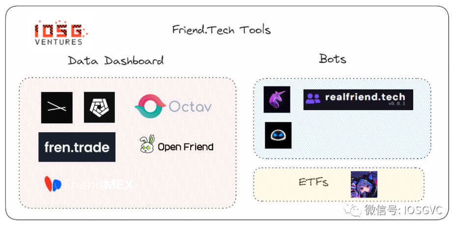 由于社交产品中交易数据和行为不够直观,随着 Friend.tech 用户对交易需求的增加,可以看到,围绕 Friend.tech 的生态正在逐渐形成,开发者逐渐开发出了各种工具,比如 Paradigm 工程师提供的数据看板 FriendMEX,将 kol 代币价格进行了可视化,以及新用户和新交易的监控,Parsec, Arkham 针对 FT 开发了专门的数据看板,以及抢跑的自动化机器人。Unibot 上线 FriendTech Snipers bot,支持以下两种模式:用户狙击(User Snipe):支持设置一个用户名列表,并在他们创建新的密钥时进行狙击; 自动狙击(Auto Snipe):如果用户符合设置的最低关注者和粉丝数要求,也可对新创建的 key 进行自动狙击;不收取交易手续费。ETF 形式的 FT 基金的出现,也使得整个生态更加丰富。以 Herro 为例,其筹集了 120ETH 作为初始基金,用于购买头部蓝筹 key,集成房间内内容信息并承诺未来空投对基金持有者进行分润,这样的操作既能以较小的资金成本获得头部 key 的涨幅,共享未来预期的空投收益,也一定程度减小了波动性和风险。