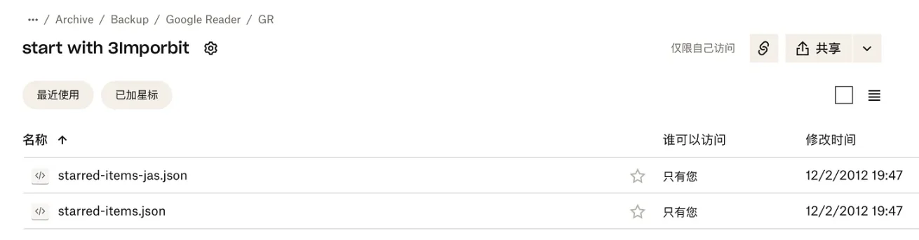 而这次得以恢复数据,主要靠的是 Google Reader 和 Dropbox。Google Reader 是一个 RSS 阅读工具,当时我主要用它订阅一些科技媒体、设计和生活类的博客等。对于优质的内容我经常会用收藏功能,方便之后查阅。后来 Google Reader 在 2013 年 7 月停止运营,不过他们提供了数据导出功能,我就把我所有收藏的内容导出了,然后存在了 Dropbox 中。