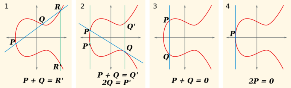 另一方面,两个椭圆曲线点的加法定义如下图所示: