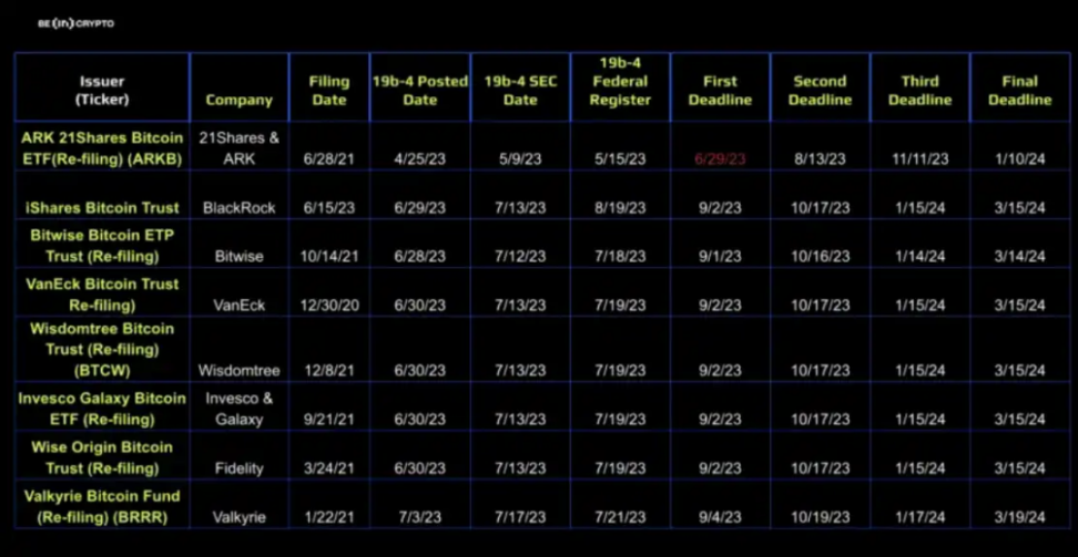 目前已提交 SEC 申请的八支比特币现货 ETF: