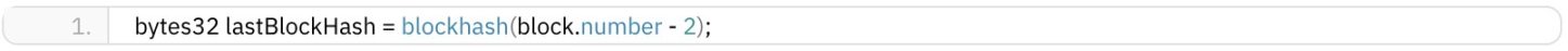 在 Solidity 中,如果我们想要检索两个区块前开采的区块哈希值(回溯计数从包含交易的区块开始),可以使用以下语法: