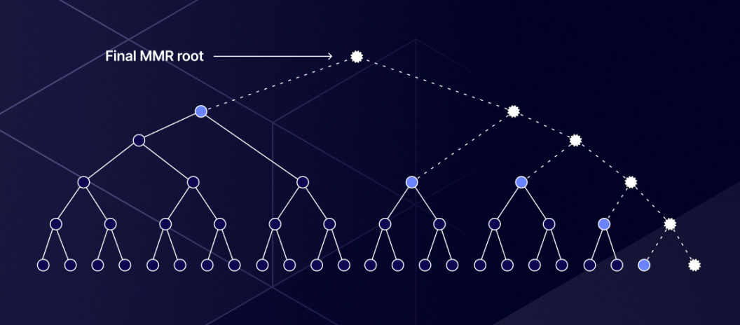 对所有前序区块的区块哈希值进行类似的计算处理,直到追溯至以太坊主网的创世区块。这些哈希值都会附加到 MMR 树中,从而创建一个最终的 MMR 根。