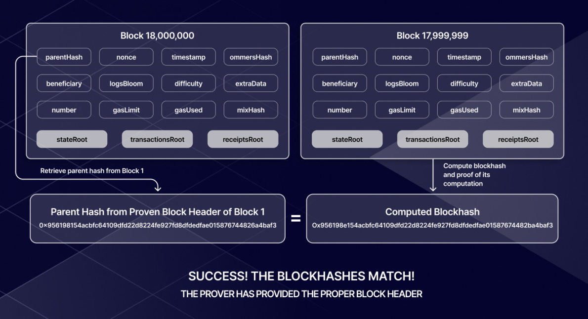 下一步是从一个存档节点检索区块 18,000,000 的区块头信息,通过链下计算得出它的区块哈希值,并与已注册的区块哈希值 0x95b1…4baf3 进行对比。这个计算过程同样会通过一个证明器来创建这一计算的证明。