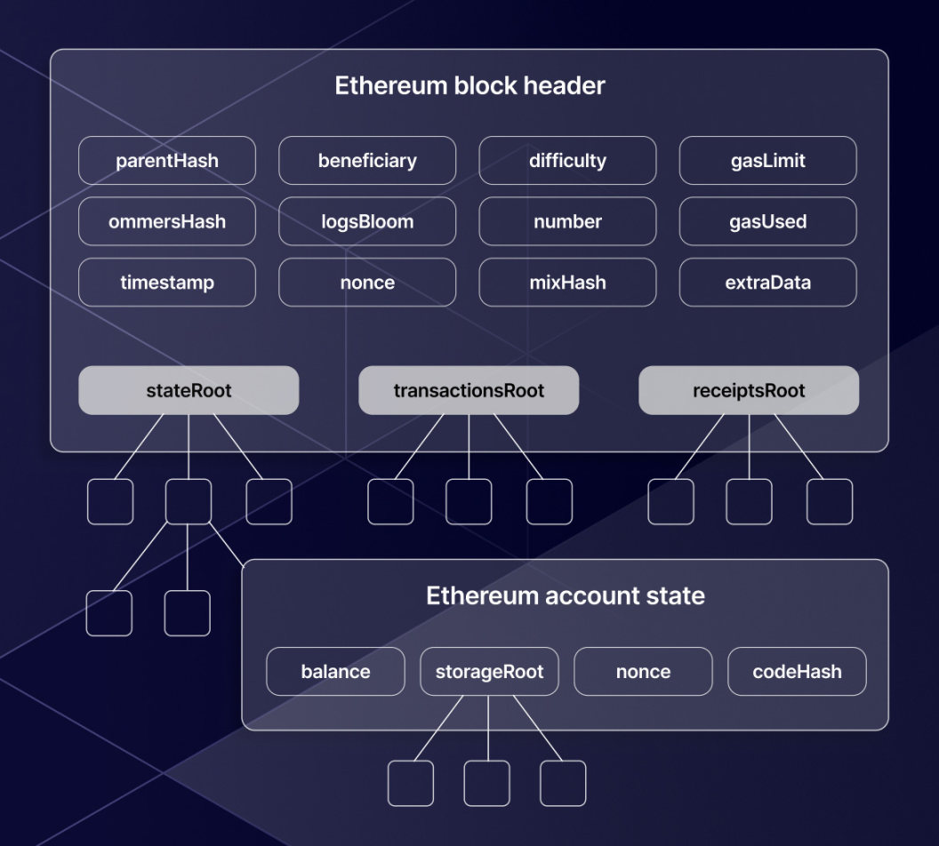 一棵包含所有以太坊账户状态的默克尔帕特里夏树(Merkle Patricia Trie)被构建起来,其哈希值作为状态根储存在区块头(在上图中标记为 stateRoot)。这个状态根包含了证明任意特定时间点整个以太坊网络状态所需的所有信息。