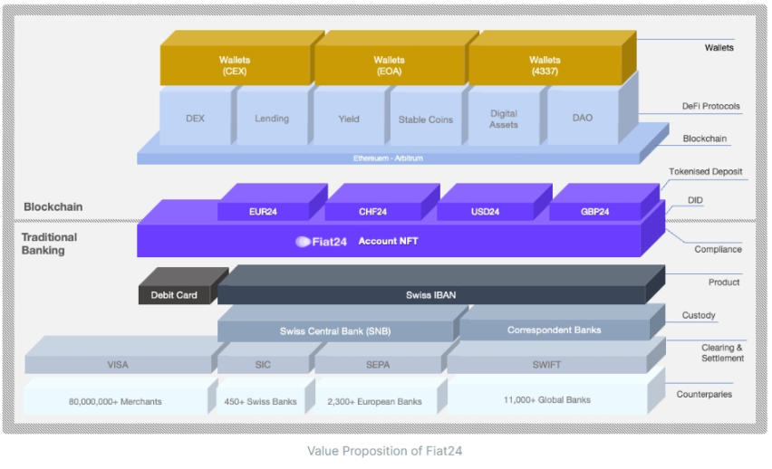 Fiat24 依托金融科技牌照,已获准加入瑞士银行间清算(SIC)支付系统,并在瑞士国家银行(瑞士中央银行)内拥有结算账户。同时,也能够与 SWIFT、SPEA、VISA 等全球支付结算体系相连接,所有现实世界的支付交互数据都记录在 Arbitrum 区块链上。
