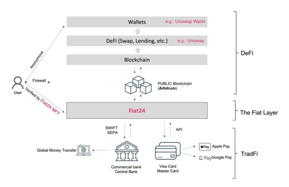 与任何其他传统银行不同,Fiat24 面向众多非托管钱包用户,通过 NFT 来识别用户信息。可以将 Fiat24 想象成 DApps 的法币协议层(Additional Fiat Layer for DApps),例如架构在 Uniswap 之下的 Fiat Layer Banking Protocol。