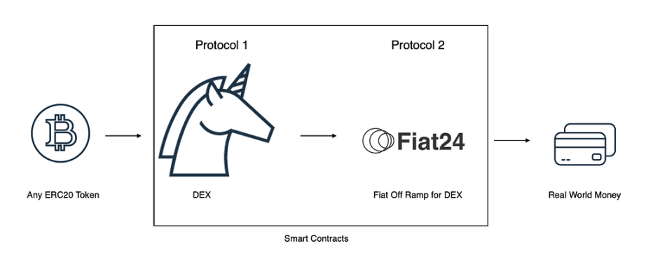 Fiat24 这种连接加密钱包、银行账户的加密消费支付场景,可以说是一个传统银行、支付业务的迭代,因为集成了多个服务,比如 Uniswap 的 Swap,USDC 到换法币的出金,法币到商家的结算支付等,并通过智能合约驱动这一整套流程,从而能够实现从加密资产到法币的丝滑用户体验。