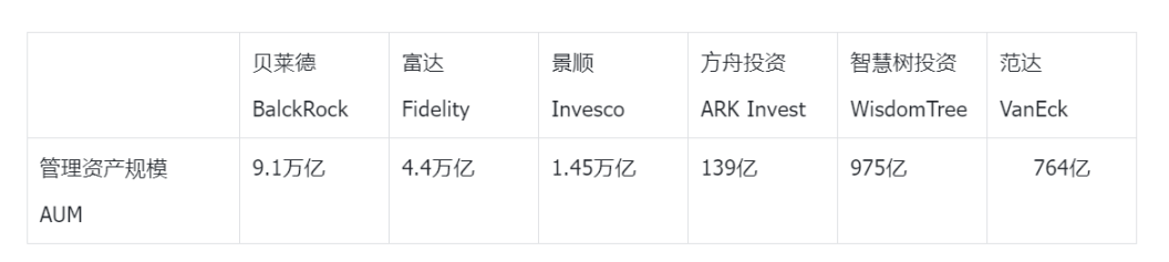 现货 ETF 的这些申请者中,需要重点了解的是贝莱德、富达和景顺这三家,加密市场的所有机构规模之和、甚至加密市场资产规模总和都不及这三家任意一家的管理规模。