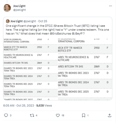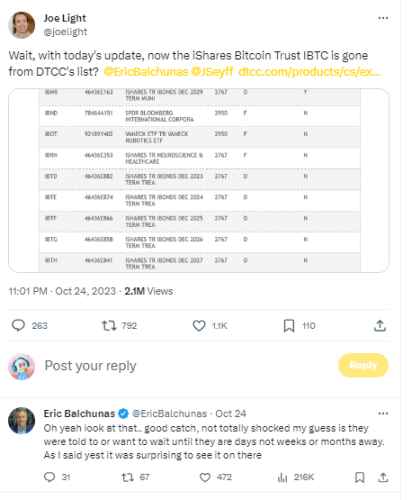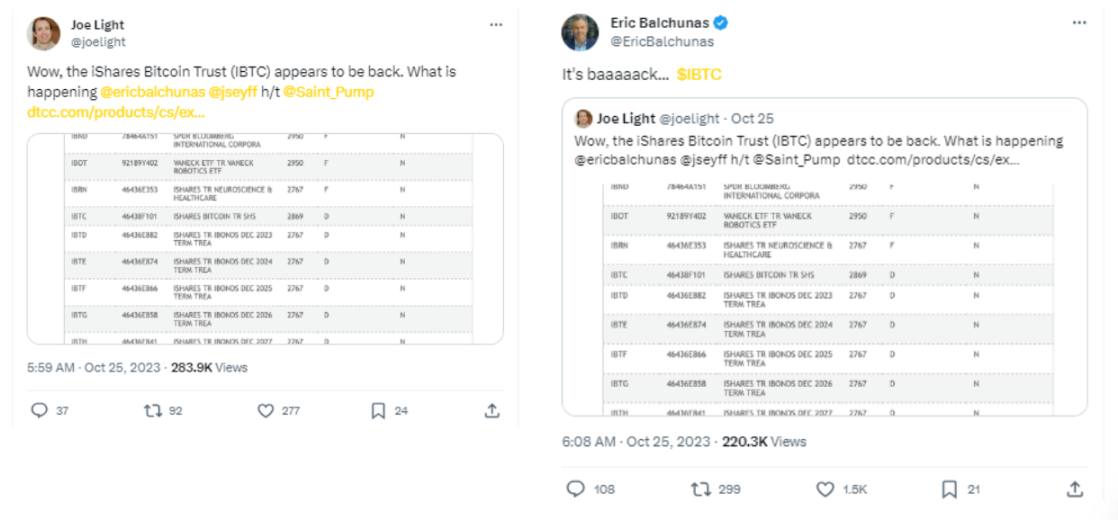 不到一天,巴伦周刊编辑 Joe Light 发推文表示发现贝莱德的「IBTC」竟然从官网消失了。彭博社 ETF 分析师 Eric Balchunas 则猜测,「IBTC」被告知要等到离实现日期只有几天的时候再公布,而不是几周或几个月的时候再公布。