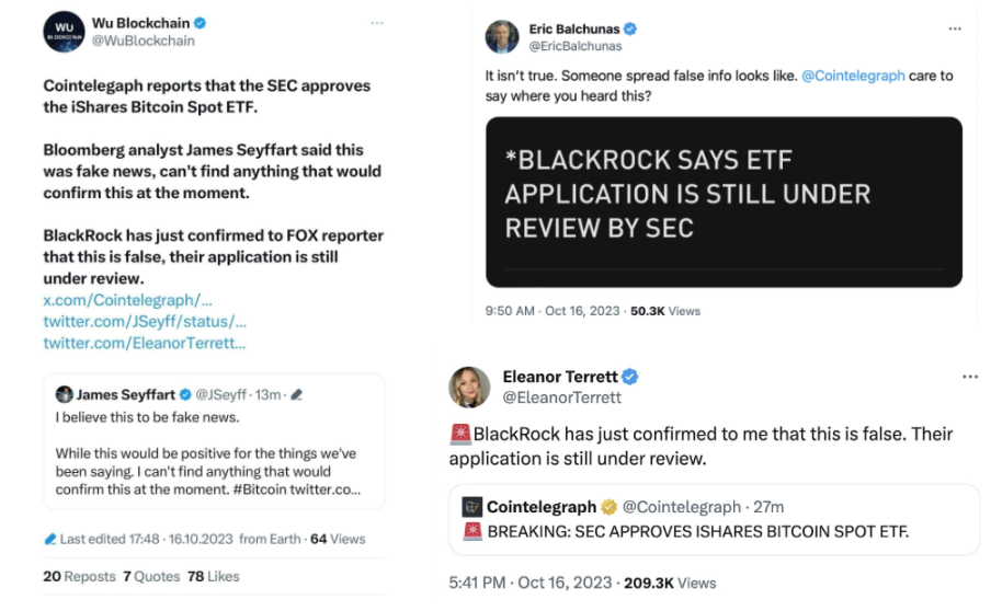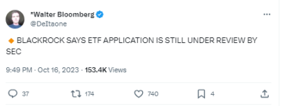 很快,这条消息遭到了彭博社 ETF 分析师 James Setffart 质疑真实性。紧接着美股开盘后没多久福布斯知名记者 Eleanor Terrett 和彭博社 ETF 分析师 Eric Balchunas 均发推称贝莱德告知 ETF 仍然在审核中。