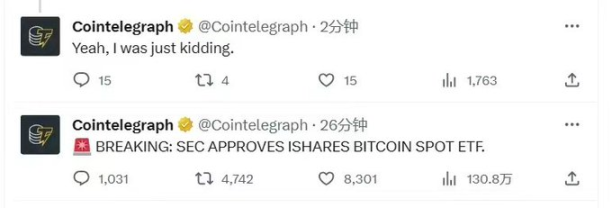 这是从 Cointelegraph 发出这条消息不到半个小时的推特。