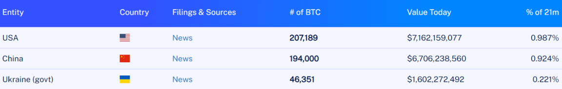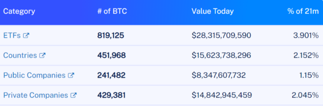 想要看公开交易和私营公司、ETF 和国家的 BTC 持有量,可以去:https://buybitcoinworldwide.com/treasuries/,从而对各方势力对于比特币持有情况有一个大致的了解。