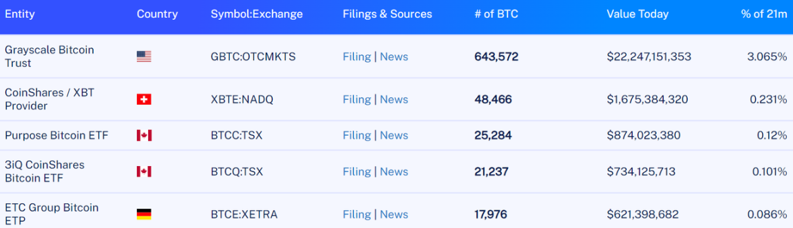 值得注意的是,有一些庞然大物是没有在这里面统计的,包括大家比较熟知的币安(公开持有量 50 万枚比特币)、Bitfinex(公开持有量 19 万枚)、贝莱德(没有披露)。