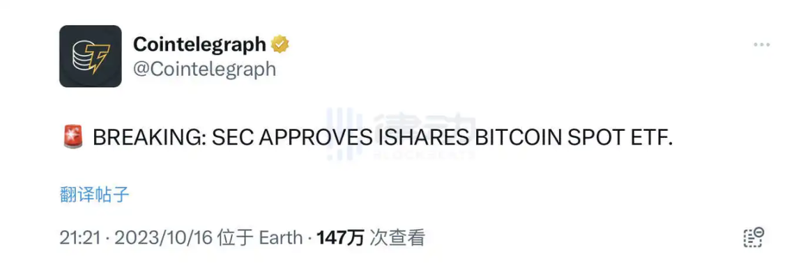 北京时间,21:21,据知名加密媒体 Cointelegraph 报道,美国证券交易委员会已批准贝莱德的 iShares 比特币现货 ETF。