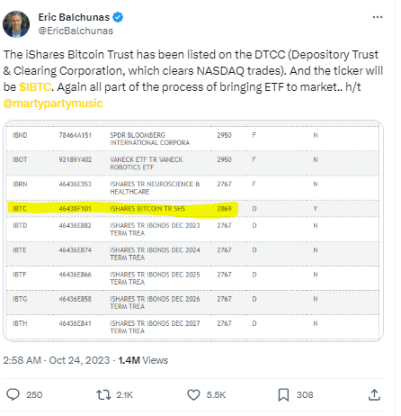 北京时间,2:58am,彭博社 ETF 分析师 Eric Balchunas 发推说 iShares 比特币信托(资管巨头贝莱德子公司)已在 DTCC(存款信托与清算公司,负责纳斯达克交易清算),上市股票代码为$IBTC。
