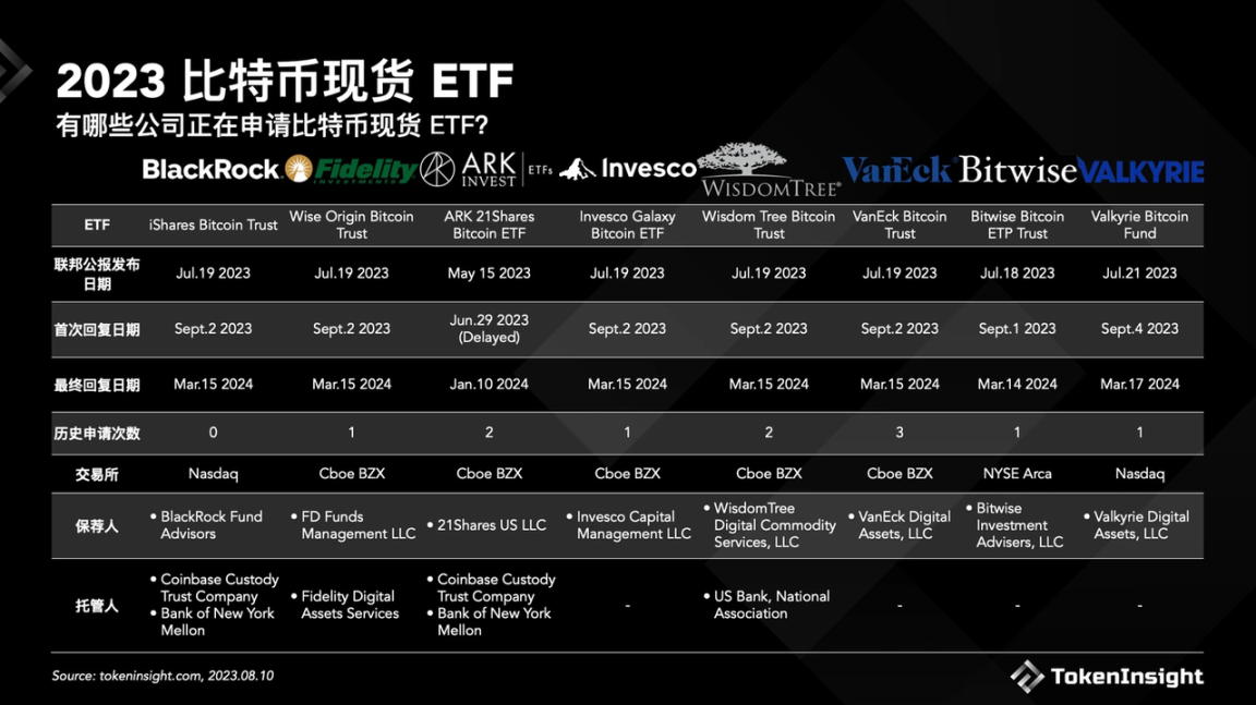 根据 Tokeninsight 的比特币现货 ETF 申请审核的关键时间节点,大部分都在 2024 年第一季度末,而最重要的三家机构贝莱德、富达和景顺的申请最终回复日期均为 2024 年 3 月 15 日,无法忽略这三家金融巨头的政治影响力在促使比特币现货 ETF 申请中产生的推动作用。