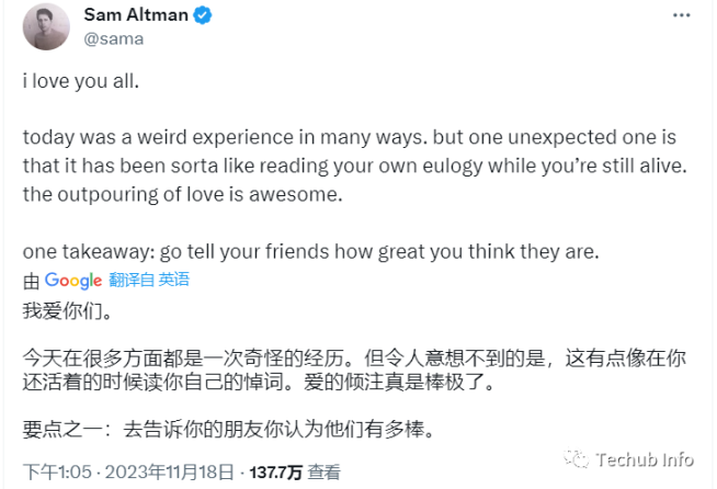布罗克曼在 X 上表示,他和奥特曼对董事会所作所为感到震惊和悲伤,他梳理了事件的时间表如下:11 月 16 日晚,奥特曼收到 Ilya(OpenAI 首席科学家、董事会成员)信息,要求 11 月 17 日中午谈话。11 月 17 日,在谷歌会议上,董事会告知奥特曼被解雇,布罗克曼不在场。11 月 17 日中午,布罗克曼收到 Ilya 消息要求通话,在谷歌会议上,他被告知从董事会除名,但保留他的职位。关于这些调整,管理层事先都不知道,只有现任 CEO 米拉在前一晚提前知道消息。有分析人士指出,“此前毫无预兆,或许因技术和社会道德的冲突所致。”iPollo 首席科学家孔华威对 Techub News 表示,OpenAI 董事会罢免 Sam Altman 是因为他们担心安全问题,应该是某些大规模市场化所引发的“安全”问题被 Altman 等掩盖了,Altman 希望快速推进 AGI 的诞生。