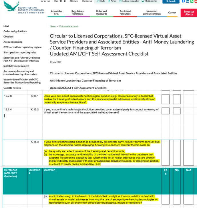 近日,香港证监会在其官网发布“致持牌法团、获证监会发牌的虚拟资产服务提供者及有联系实体的通函 - 打击洗钱/恐怖分子资金筹集经更新的《打击洗钱/恐怖分子资金筹集的自我评估查检表》”,其中在更新的《打击洗钱 / 恐怖分子资金筹集的自我评估查检表》中再提区块链分析工具。具体而言,证监会在“与虚拟资产交易及活动有关的持续监察”部分强调区块链分析工具的重要性。