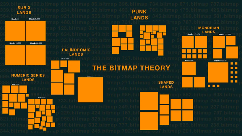 位图理论(Bitmap theory)由推特用户@blockamoto 在 2023 年 6 月 13 日提出。这一理论将比特币区块中的每笔交易输入映射成地块(Parcel),形成一个街区或区域(District)。不同交易输入的大小差异导致映射出的地块大小也不同。