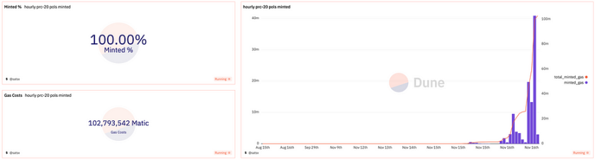 特别是在 11 月 16 日,Polygon 网络的 Gas 费用急剧上升,高达 1800 gwei,原因是社区发现了今年 5 月部署的 PRC-20 标准代币 POLS。根据 evm.link 的数据,POLS 的总发行量为 2100 万张。