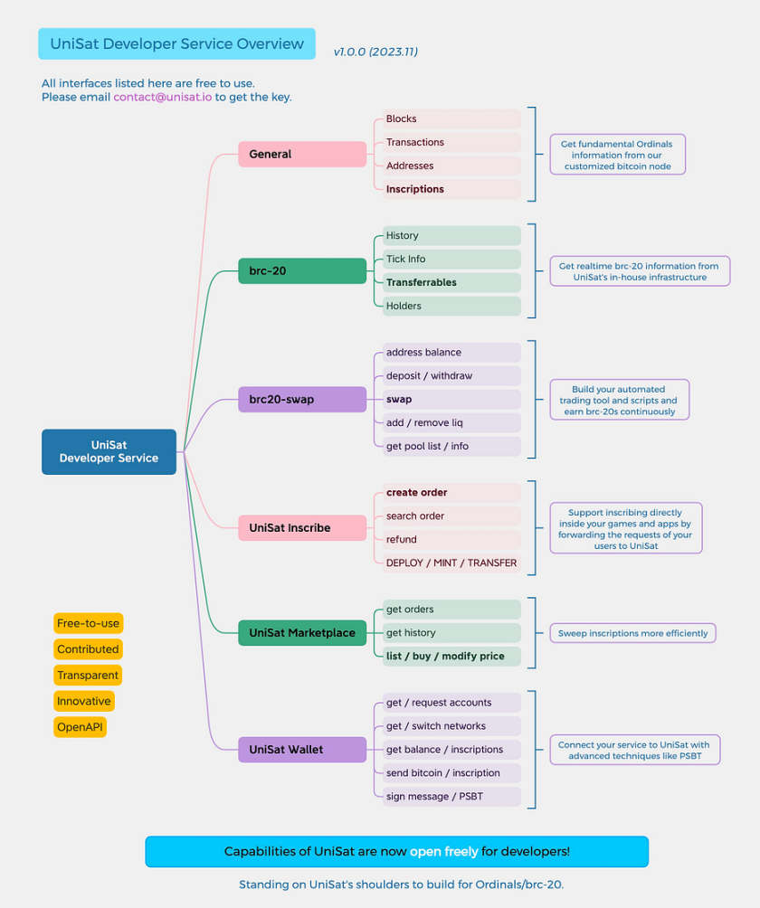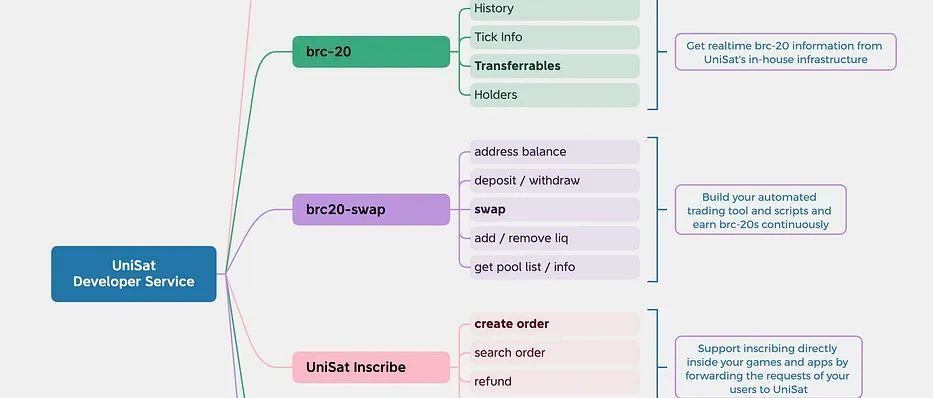 随着资金不断地涌入铭文市场,用户不再满足于 meme 的炒作,开始将目光转向基于铭文的应用。本文中提到的 BRC420 就是典型的例子。Unisat 也为 BRC20 带来创新,通过 BRC20-Swap,用户可以像 AMM DEX 一样轻松交换 BRC20 代币,作为第一个提高 Ordinals 生态流动性的产品,它有望将比特币 DeFi 生态系统的潜力释放出来,未来可能会出现更多功能比如借贷和衍生品。近期 Unisat 还开放了 API 接口,这对于小型开发者来说非常友好,可以调用很多功能,比如自动批量扫单,监控铭文并自动 mint,由此可以产生非常多的工具类项目