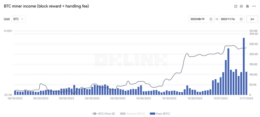 而在矿工利益方面,近期的数据表明,随着像 Ordinals 和 Atomicals 这样的项目的兴起,比特币铭文市场正在经历一场空前的繁荣。根据 oklink 链上大师的数据,在过去三个月中,比特币矿工的收入有显著提高,特别是在 11 月,链上手续费贡献的占比从 8 月 19 日的 2.4% 上升至 11 月 16 日的 23.46%。这一增长主要得益于 Ordinals 交易对的引入。这表明比特币铭文市场的发展显著提高了矿工手续费收入的比例。预计到 2024 年 4 月的比特币减产时,这一比例可能达到 50%。