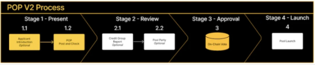尽管协议是建立在去中心化网络上的,但是涉及链下金融资产体系的固有风险依然不可忽视。由此,由金融和借贷领域的专家组成的资产上链评估小组(Centrifuge Credit Group)推出了资产池上链流程(Pool Onboarding Process V2),以进一步提升资产上链流程的透明度并把控风险。